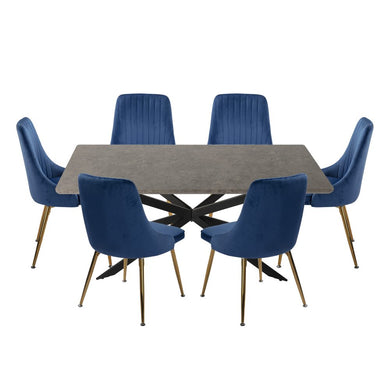 Dining Set Rectangular Table with 6 Navy Velvet Chairs