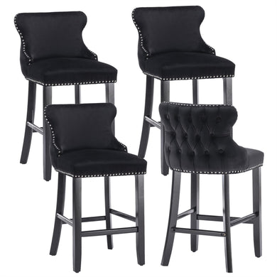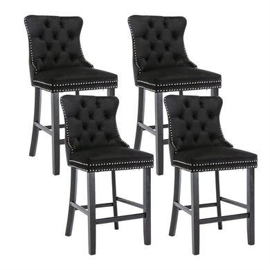 4x Velvet Upholstered Button Tufted Bar Stools with Wood Legs and Studs-Black