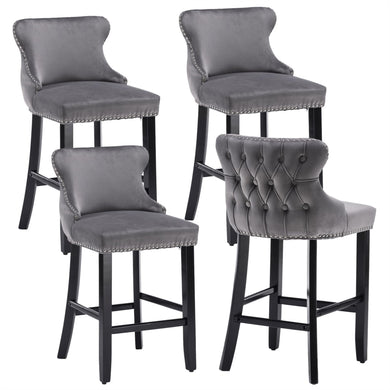 4x Velvet Upholstered Button Tufted Bar Stools with Wood Legs and Studs-Grey