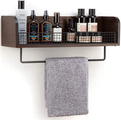 Wall Mount Rustic Wood & Black Metal Bathroom Shelf with Towel Bar