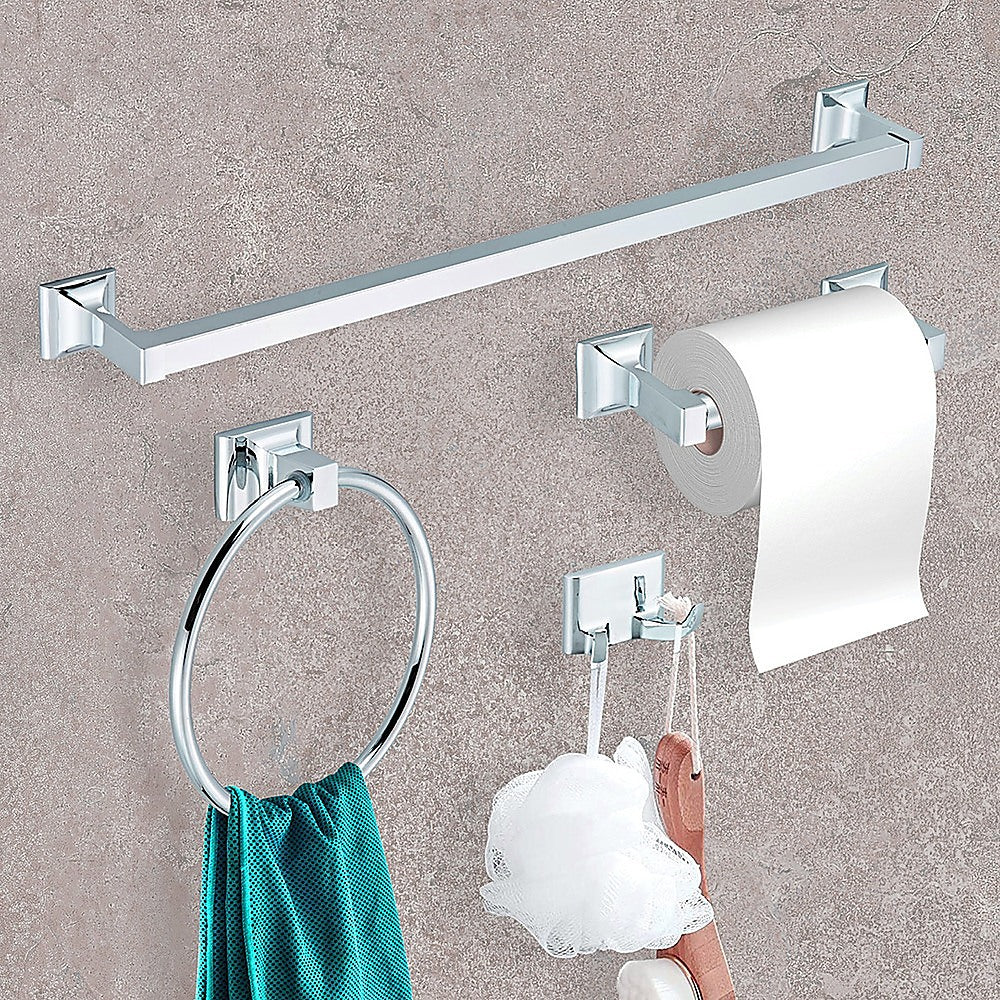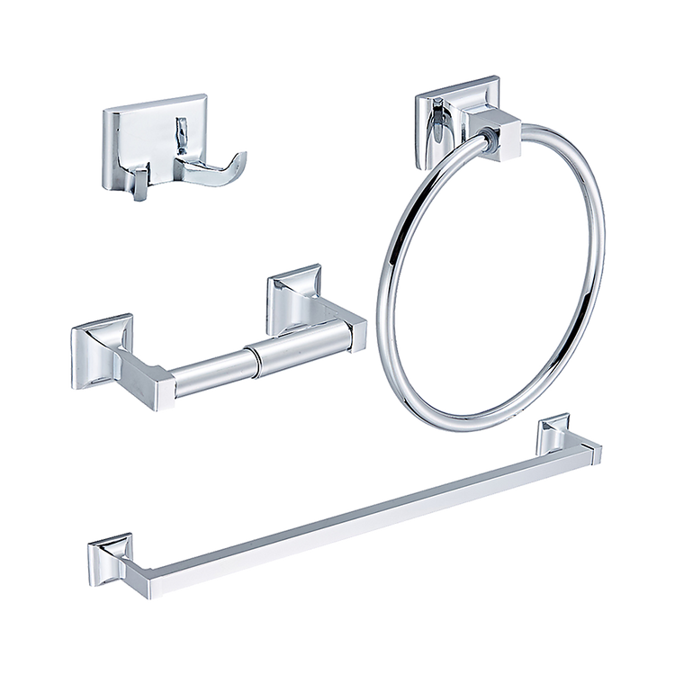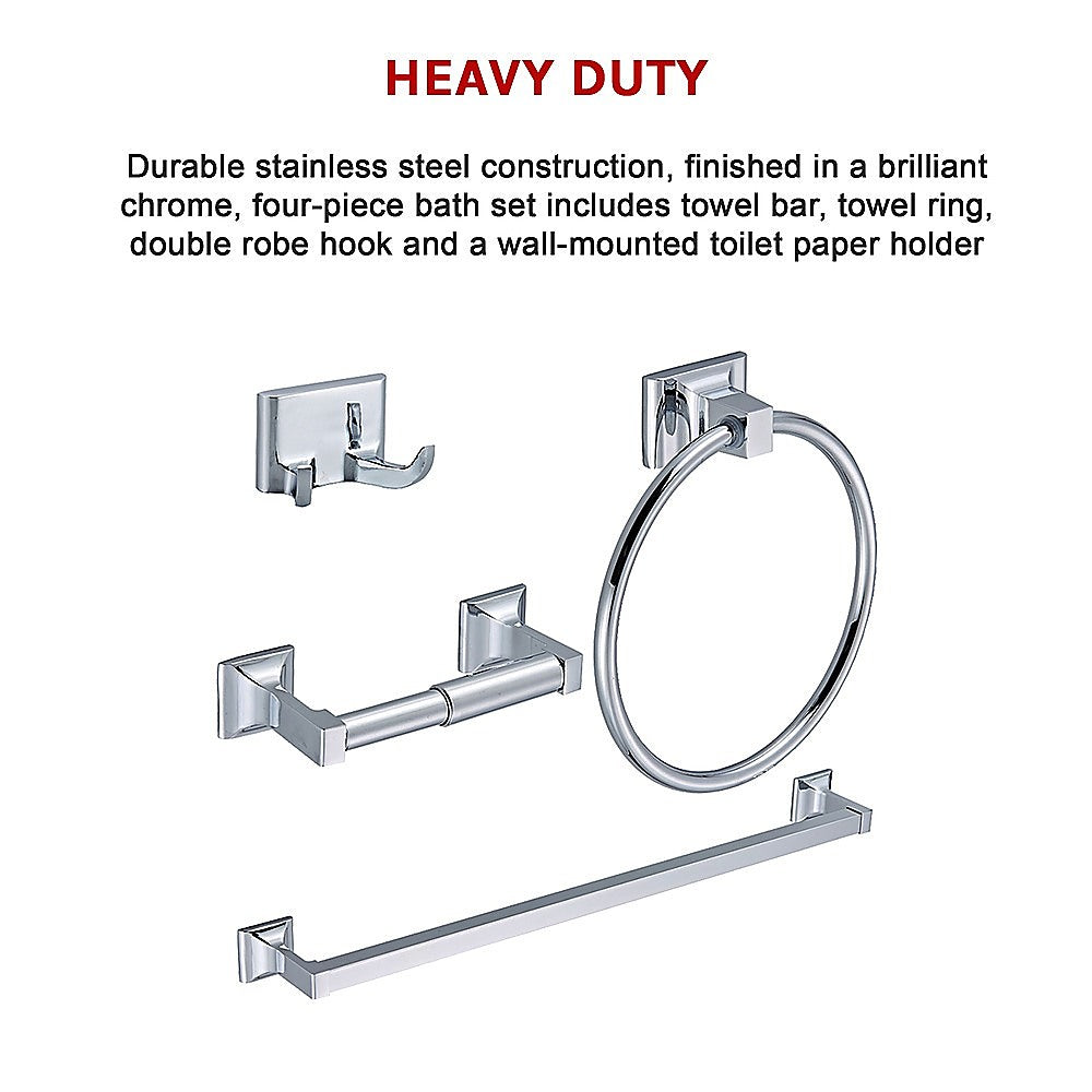 - Includes: 61-centimetre towel bar, towel ring, double robe hook, and a toilet paper holder