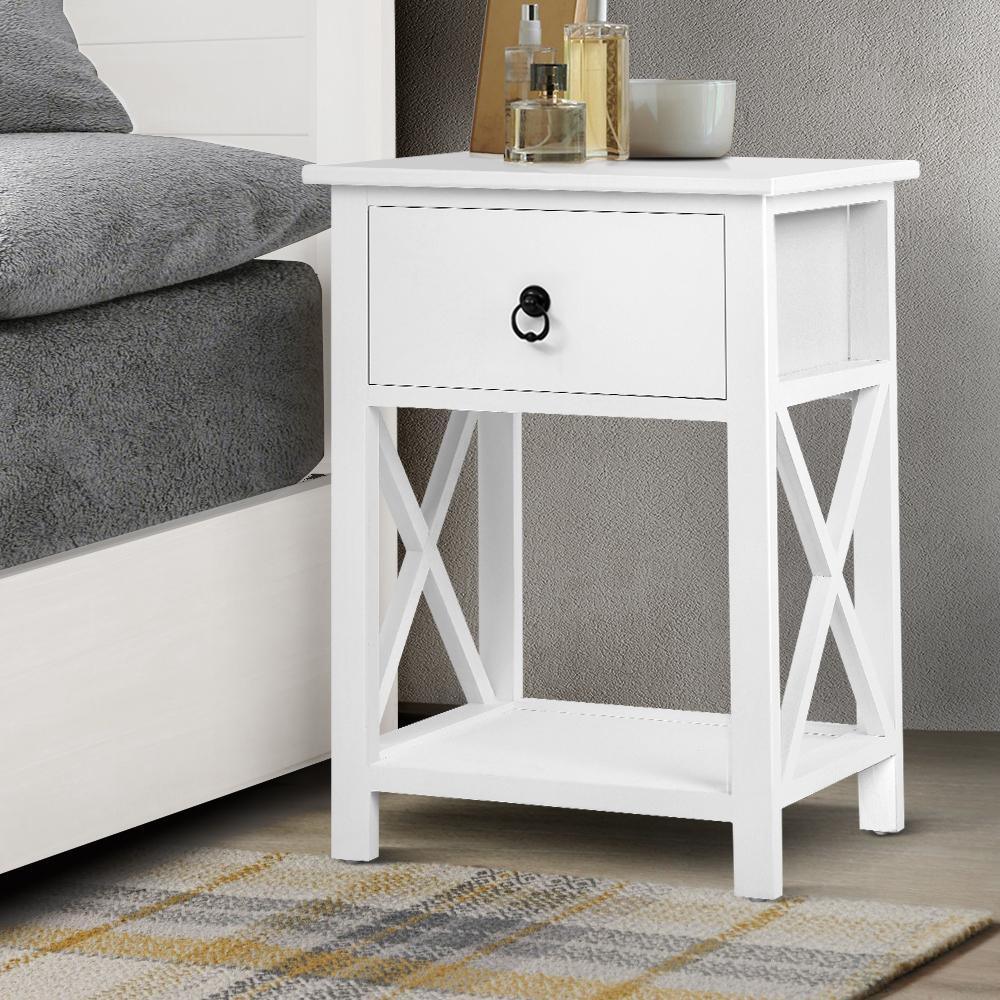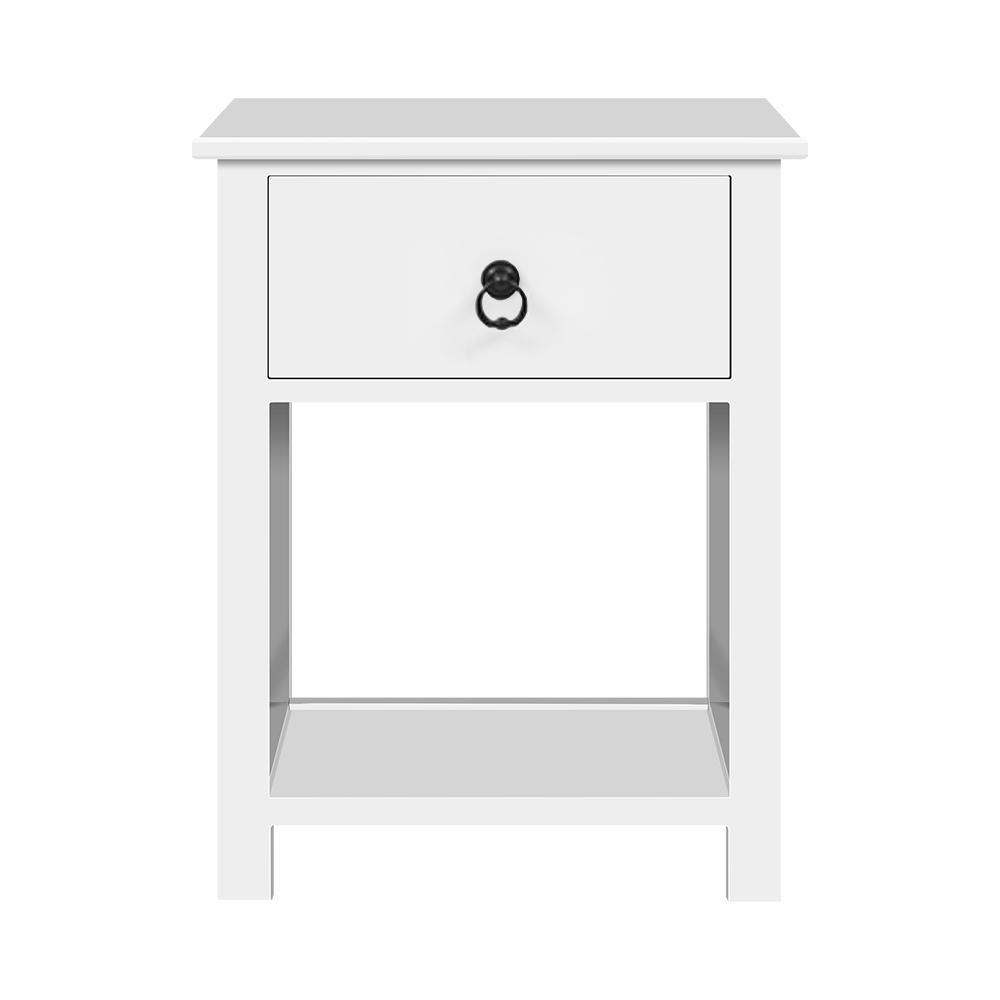 Crafted from solid Paulownia wood for its durable quality, these white country cottage bedside tables also feature a smooth MDF board top for ultimate strength and resilience. They are also finished in a moisture-resistant non-toxic paint to enhance their environmentally friendly appeal. The generous-sized storage drawer is fronted by a vintage-style ring handle. Use the bottom shelf to display aesthetic objects or for books.