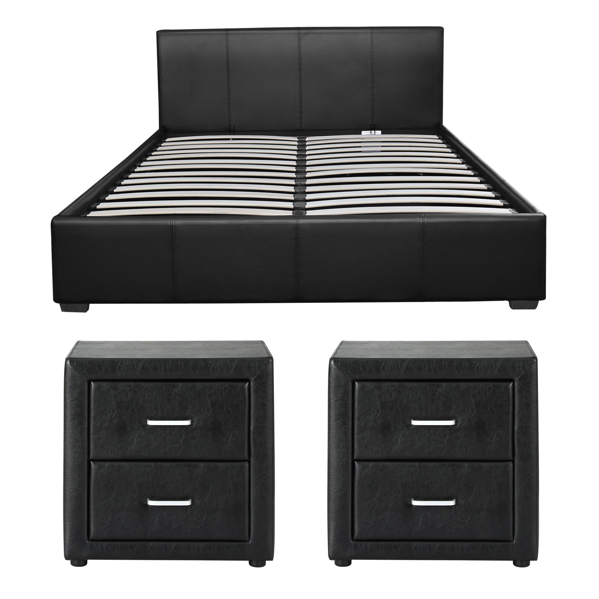 Artiss Gas Lift Queen Bed Frame and 2 Bedside Table Set Leather Black
