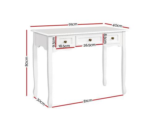 Perfect for the hallway, lounge or any room in your home that requires a standout piece, this French provincial console table offers a gracious presence with great functionality. Can also serve as a wonderful front console table for a café or shop to welcome customers with chic and charm. Made of high quality MDF board for the tabletop and sturdy paulownia wood for the rest, the console table looks absolutely beautiful with its meticulous craftsmanship and fine lacquered finish. Three generous-sized drawers with exquisite antique-style metal handles provide ample storage space for your essentials and knick-knacks while the wide tabletop lets you display your favourite home décor in resplendent style. Make a grand entrance for your guests or even for yourself with our vintage console table. It will be a gracious welcome indeed.