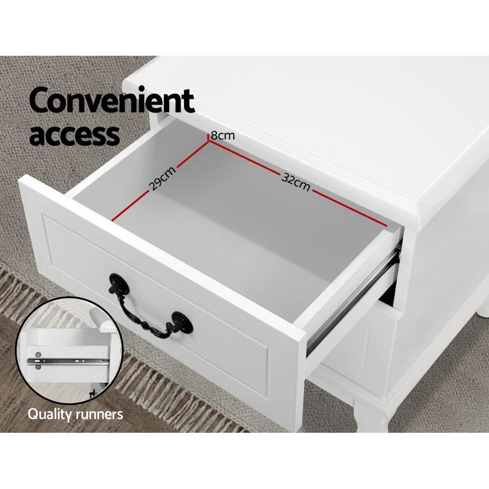 Add French provincial to your home with our charming Bedside Table. It is not only the design that is timeless, but gorgeous. The bedside table itself is made to both last and please, with 15mm thick MDF boards, beautifully curved pine wood legs, anti-rust drawer runners and retro metal handles. Two large drawers provide plenty of storage for all your bedside essentials so that everything is close. The classic design means that the bedside table will suit any bedroom…or any room for that matter, like the living room or couch end...