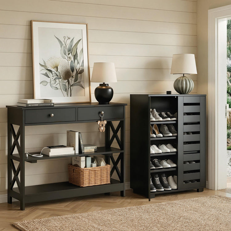 Revamp your entryway with this ultimate 2-piece black furniture set, featuring a smart console table and a ventilated shoe cabinet. The 100x30x80cm console table boasts a built-in charging station (2 AC, 2 USB, SAA-approved 1.5m cord), a spacious drawer, and a stable X-shaped frame. The 60x33x86cm shoe cupboard features push-to-open slatted doors to prevent musty odours, plus 3 adjustable shelves for customisable storage. Both units include anti-tip wall mounts for maximum household safety. Crafted from premium MDF and particle board, they offer exceptional durability and easy wipe-clean maintenance. Shipped in 2 packages. Organise your hallway with effortless style today!