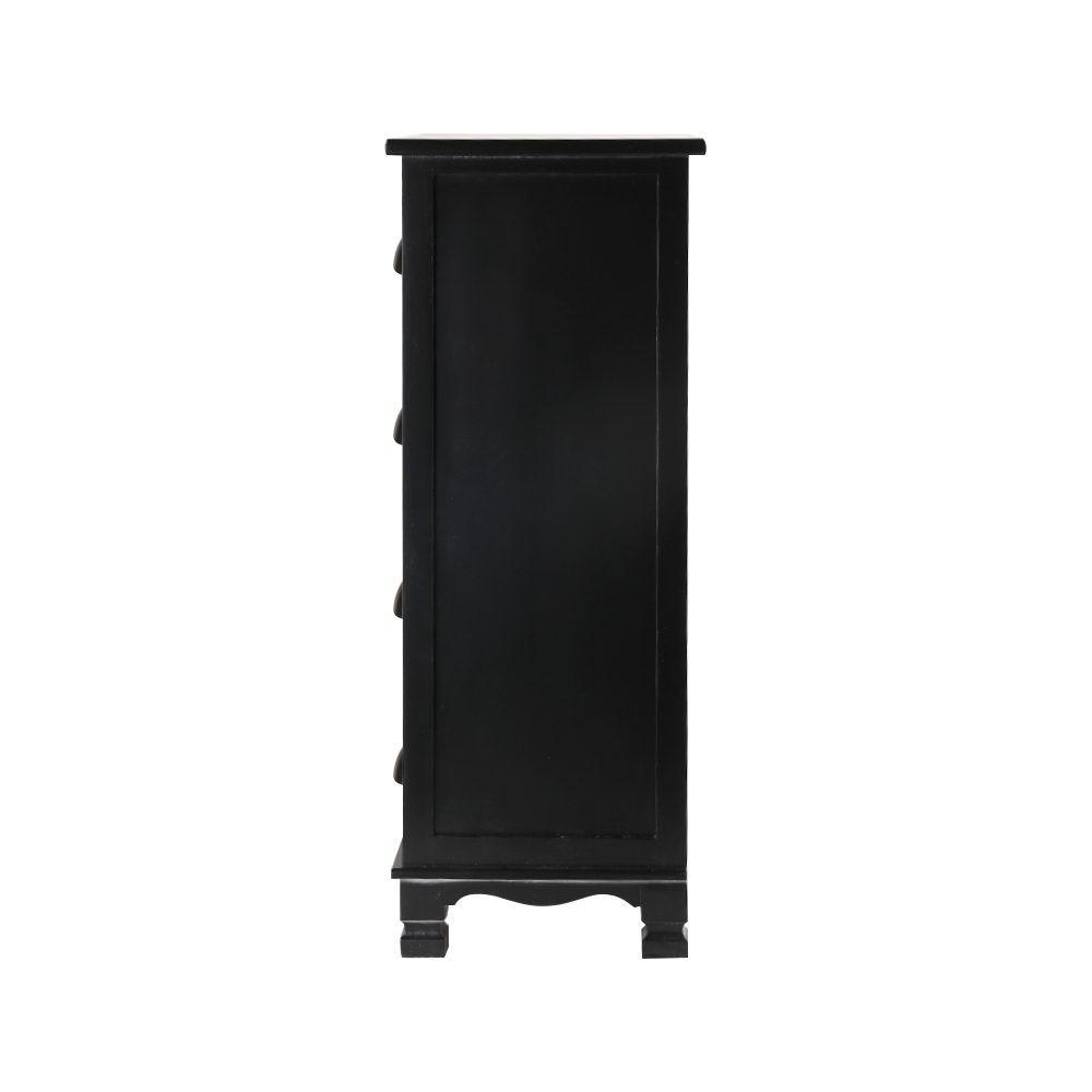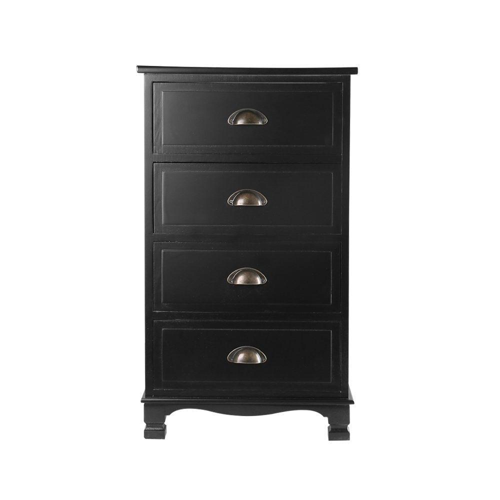 This classic, modern provincial black 4 drawer bed table exudes timeless elegance and makes an excellent addition to any home. Crafted from solid Paulownia wood, the cabinet is stable and durable. The drawers provide ample space and come with stoppers to prevent the drawers from falling out completely. It features round corners to avoid injuries, a non-toxic paint finish and anti-scratch feet pads to keep floors and surfaces pristine even with robust use. It also comes fully assembled so you can install it right out of the box.