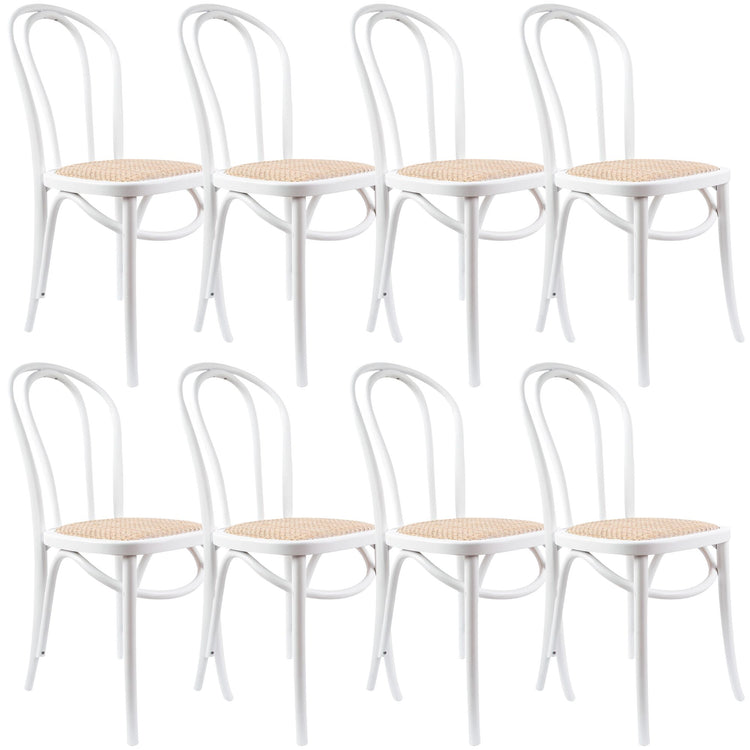 A stylish dining chair enhances mealtime enjoyment. Realize this happiness by decorating your dining area with this attractive 8-piece set of dining chairs in white, designed in the traditional style. The chairs, featuring timeless arched back style with a woven rattan padded seat, ensure lasting comfort. Because of their wooden construct, and curvy legs, they are a beautiful addition to your dining space. They look stunning in all decor settings, thanks to their homely style and sleek design. The beautiful chairs are made of high-quality Birch timber and Rattan obtained in a sustainable manner. A one-year warranty is included with the fully assembled dining chairs.