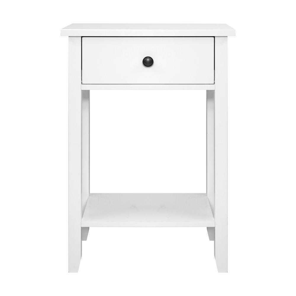 Need a simple and classic bedside table for your home? Look no further than our Bedside Table which is absolutely lovely in every aspect. Made of high-quality E1 MDF and pine wood, the bedside table is sturdy and durable. The NC lacquer finish is flawless and smooth to the touch. The bedside table will suit any bedroom with its neutral white tone and clean lines but will be the perfect addition to a natural or country Hamptons style bedroom due to its classic design with retro metal knob handle. Or you can use it in any space or in any room where a convenient and compact drawer will do wonders for your storage needs. And it offers ample storage space with one smooth-opening drawer and a large bottom shelf for all your bedside essentials, so that everything is close at hand.