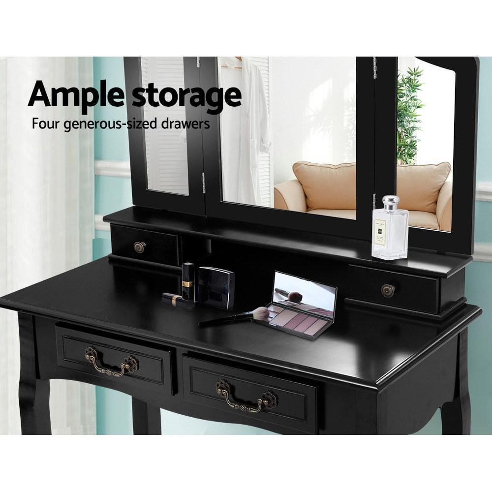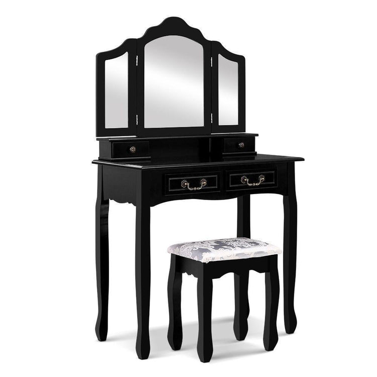 Made with meticulous craftsmanship, the dressing table features a large three-panel mirror and four detailed drawers with exquisite antique-style metal handles that provide ample storage space for jewellery and makeup. The side mirrors fold 180° so that you see yourself from any angle or completely close the mirror when not in use. It also features a compensated table design that allows more leg room for seating comfort. Includes a beautifully embroidered padded stool.