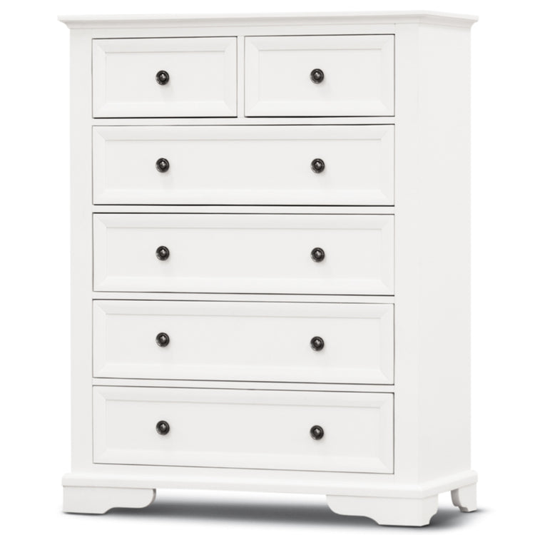 Stop wasting time worrying about where to keep that diary and those notes that you need in your bedroom on a regular basis. Bring home this 6-drawer tallboy and solve your bedroom's storage space problem forever. Crafted in the coastal style, the tallboy complements your bedroom wonderfully. It has 2 small drawers over 4 large and spacious drawers. All the drawers have full metal extension runners and shiny black metal knobs.;The top drawer has black felt for the safe storage of delicate items. The tallboy is made of sustainably harvested solid acacia timber. The wood is known for its good looks, shock-resistance, and durability. The furniture piece in a white painted finish goes well with a variety of interior decor styles, and a one-year warranty is included with the fully-assembled tallboy.