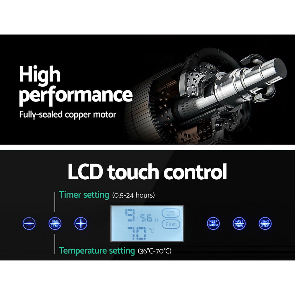 If you love healthy snacks or need to follow a diet plan, our Devanti Food Dehydrator is a must-have. Dehydrated foods have a longer shelf life and retain the same amount of vitamins and minerals as do their fresh counterparts. Even more so, with richer and more concentrated flavours. And our food dehydrator will set you up to enjoy all this delectable goodness by creating your very own, great tasting health foods. With its ten food-grade stainless steel food trays, our food dehydrator features a complete drying system with all the necessary controls to effectively dry vegetables, fruits, herbs, meat and more. The simple LCD touch control panel lets you adjust the temperature (35°C-70°C) and timer (0.5-24 hours) to suit what you are dehydrating, while the transparent tempered glass door lets you easily monitor the drying process. And when the drying is done, cleaning the removable trays is as simple as letting the dishwasher do all the work. Not least, the food dehydrator has overheating protection to ensure safe use and comes with a SAA-certified plug.