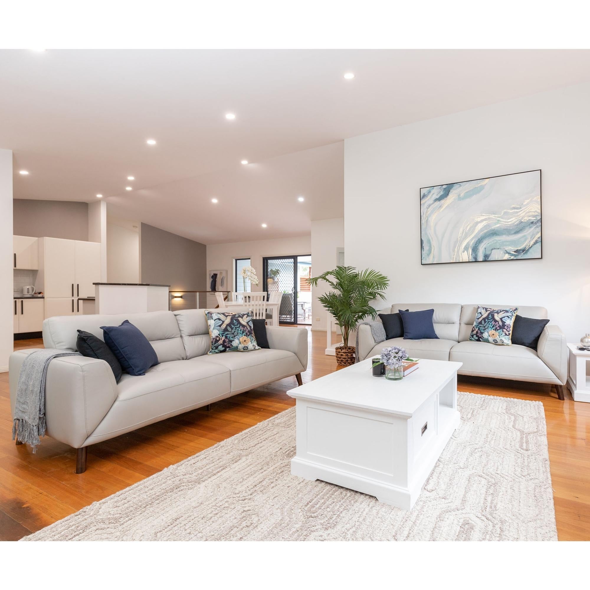 A luxurious 2-seater lounge that displays one of the best furniture arts. Place this beautiful sofa, designed in a modern style, in your living area and see it become the most lovable corner of the house. The adorable lounge features quilted seat details with super comfy lumbar support. The S-springs, webbing, and dense foam make the seats worth it. You can feel it when you sit or stretch your body on the lounge. The lounge has thick cushioning for added comfort, and it is upholstered in a 100% leather cover in silver colour. The colour blends easily with any home interior theme or living space design. The stunning sofa also features strong, timber legs. The structural frame of the lounge is made of sustainably harvested solid timber and plywood, giving it solid internal strength and making it durable. The frame has a five-year warranty; the foam and springs have a three-year warranty; the leather and stitching have a one-year warranty; and all other parts have a one-year warranty.