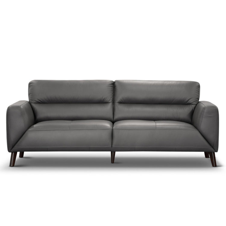 A luxurious 3-seater lounge that displays one of the best furniture arts. Place this beautiful sofa, designed in a modern style, in your living area and see it become the most lovable corner of the house. The adorable lounge features quilted seat details with super comfy lumbar support. The S-springs, webbing, and dense foam make the seats worth it. You can feel it when you sit or stretch your body on the lounge. The lounge has thick cushioning for added comfort, and it is upholstered in a 100% leather cover in gunmetal colour. The colour blends easily with any home interior theme or living space design. The stunning sofa also features strong, timber legs. The structural frame of the lounge is made of sustainably harvested solid timber and plywood, giving it solid internal strength and making it durable. The frame has a five-year warranty; the foam and springs have a three-year warranty; the leather and stitching have a one-year warranty; and all other parts have a one-year warranty.