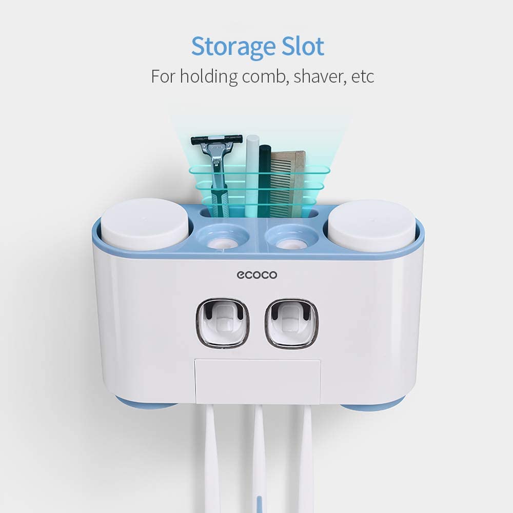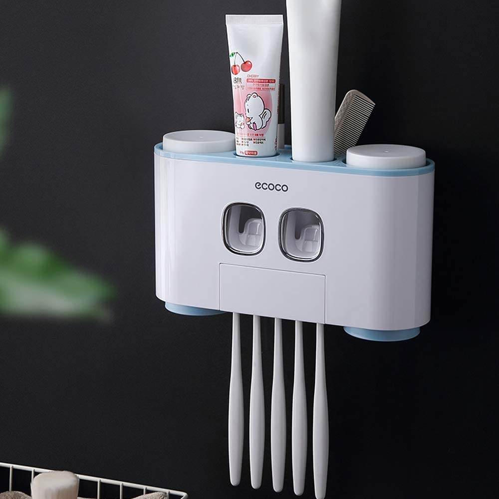 Ecoco Wall-Mounted Toothbrush Holder with 2 Toothpaste Dispensers 4 Cups and 5 Toothbrush Slots Toiletries Bathroom Storage Rack (Blue)