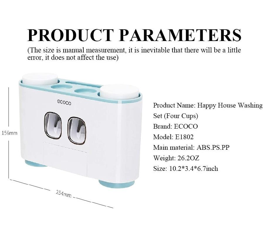 Multi-functional combination: a set of products containing 2 automatic toothpaste dispenser for children and adult, 4 dustproof environment friendly cup for 4 member of family, dust toothbrush holder, multi-functional incorporating shelves, a set of products to solve the problem of incorporating toiletries of a family.