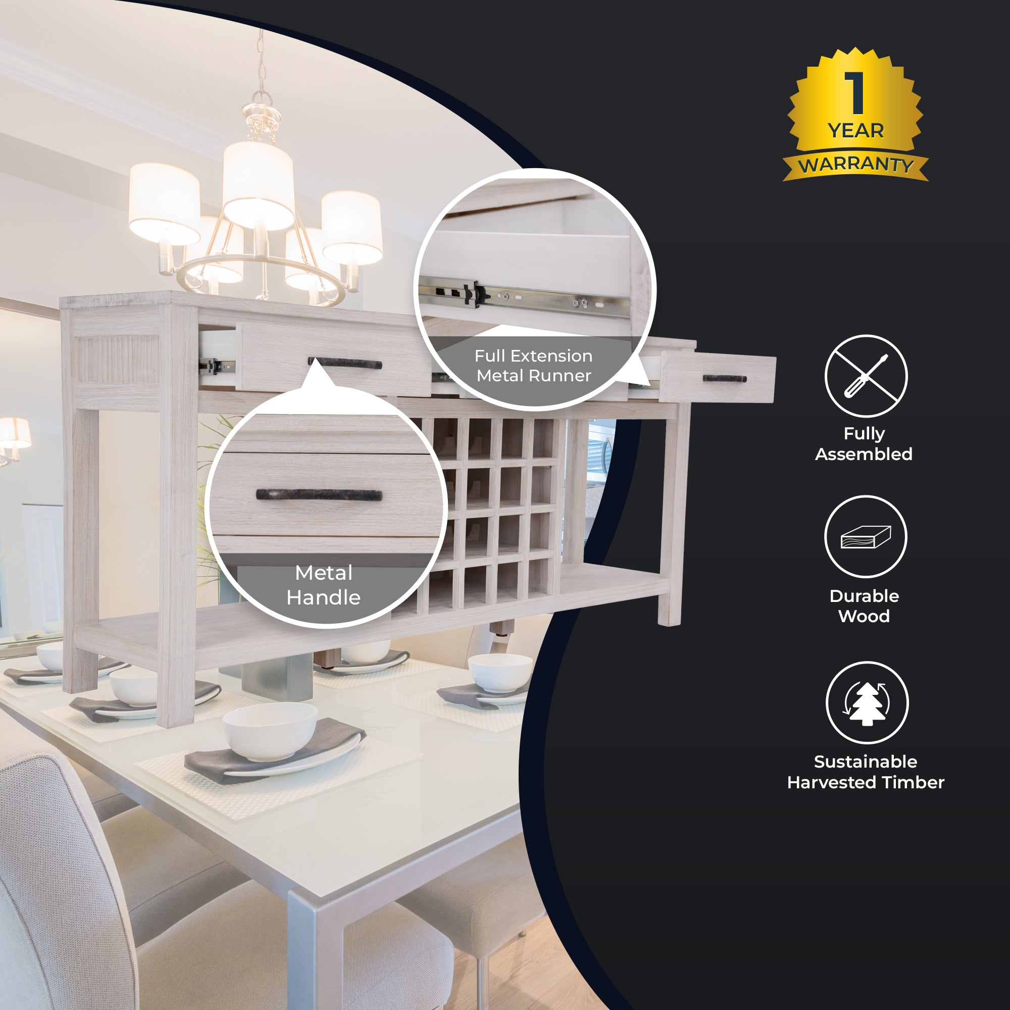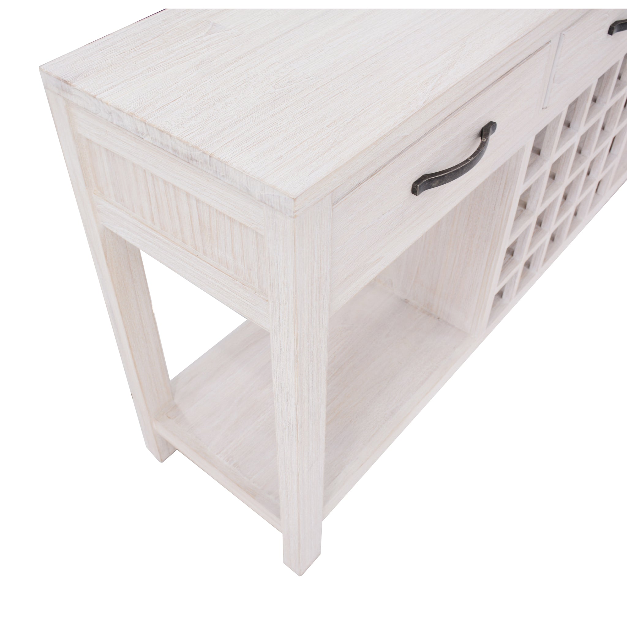 The bar area in a living room should be the epitome of aesthetic excellence. This is easily accomplished with this beautiful wine rack, designed in the coastal style. The charming wine rack has 3 drawers, 2 open shelves, and 20 deep storage spaces for storing bottles. Pretty in its appearance, this lovely furniture piece features a strong structure of mountain ash wood, obtained in a sustainable manner. The wood is known for its attractive looks, great strength, shock-resistance, durability, and ease of maintenance. The sizable drawers have full extension metal runners. Smooth-on-touch metal handles with an antiqued finish adorn all drawers. The wine rack goes well with a range of decor types because it is in Brushed White Wash finish. The fully assembled wine rack comes with a one-year warranty.