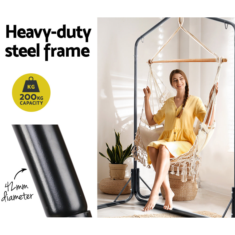 Gardeon hanging hammock chair set is a piece of excellent furniture perfect for outdoor and indoor use. It is made from quality polyester cotton blend fabric and has a solid timber rail for strength and durability, and the powder-coated steel frame is designed to be weather and rust-resistant. Our wide base hammock chair can hold up to 120kg in weight and offers stability. Plus, it’s easy to install with one single attachment point for absolute safety. This versatile furniture set is suitable to be placed by the poolside, in the backyard, or in any corner of your home. Not least, this chair offers ample support to your body.