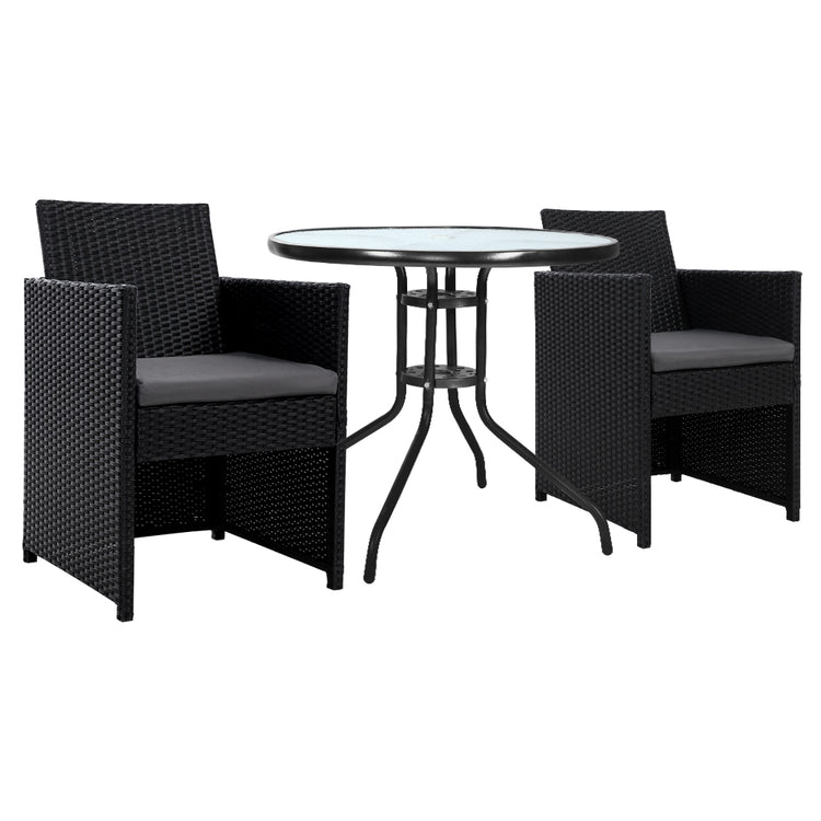 Enjoy the pleasant outdoors or have a nice chat with friends over a cuppa with our Gardeon Outdoor Bistro Set. With its chic and trendy profile, the set comes with a glass-top table and two wicker chairs. The elegant table is stunning in looks and equally as functional. The thick steel frame makes it durable and the 5mm thick tempered ripple glass does not only look stylish, it is easy to clean. Plus, there is a built-in hole for your parasol for you to relax outdoors for as long as you like during the hot summers without the fear of getting sunburnt. The chair is finished in meticulously weaved UV-resistant and weather-resistant PE wicker with a strong and sturdy steel frame construction. The exotic design, spacious seating and 5cm thick high-density foam cushions ensure comfort and style are always in place. Best of all, the removable and washable seat cushion cover makes cleaning up hassle-free. Together, the set is designed to please as well as stand up to the weather elements and the non-slip feet make the set suitable for use in even the most slippery of situations. With so much going for it, the bistro set certainly deserves its coveted space in your lovely backyard, deck or patio. Or even indoors for a unique presence.