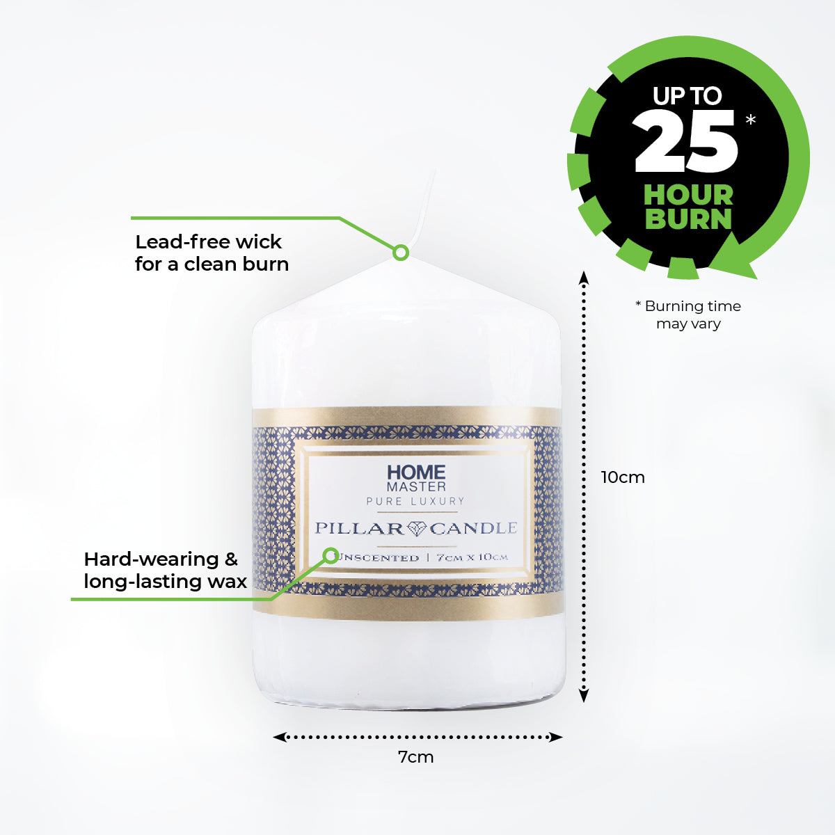 Home Master� These beautiful pillar candles create a warm, soft and charming atmosphere. Unscented, with smokeless flames and a burning time of up to 25 hours, these candles are perfect for those special occasions or events.