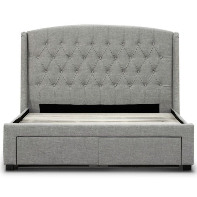 Now is the time to transform your bedroom into an ultra-luxurious retreat. Fill your personal space with this beautiful double bed with 4 drawers having an eye-catching look and design. The magnificent furniture piece in stone colour is made of sustainably harvested MDF wood, and special particle board. MDF wood is known for its resilience to moisture damage and great strength. Fully upholstered in soft polyester, the bed features thick foam and a comfortable bedhead with tufting and classy details. Robust legs made of rubber wood, strong slats, and central support provide the bed with toughness and great durability. The slats give it an excellent weight-bearing capacity. Not only that, 4 spacious drawers - 2 footboard drawers and 2 side drawers' maximize storage space, giving the bed great usability. All the drawers have full metal extension runners that help you keep the room tidy and well organized. The double-size bed that goes well with a variety of interior decor styles comes with a one-year warranty.