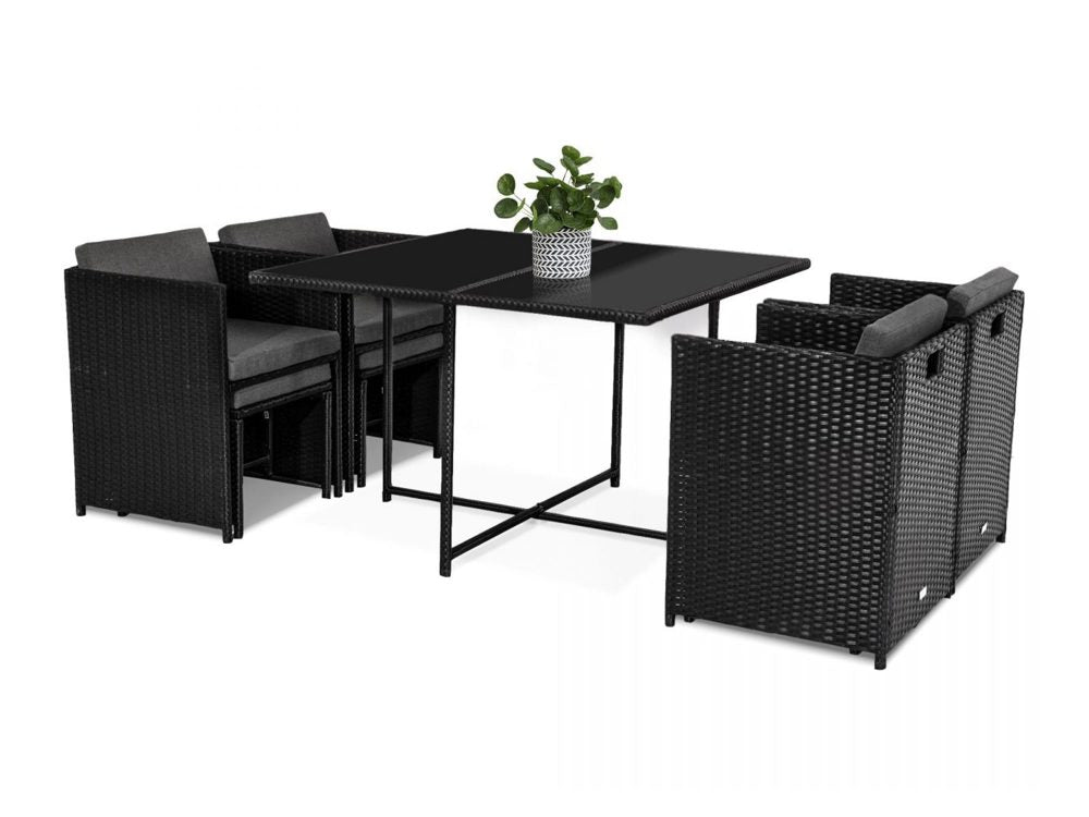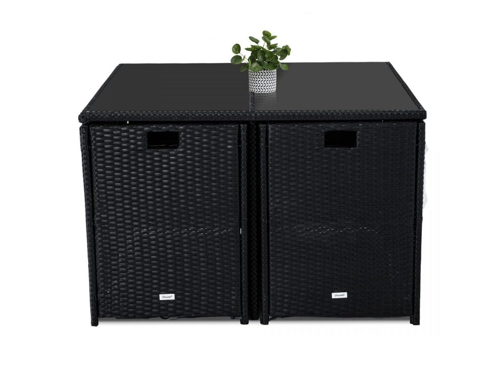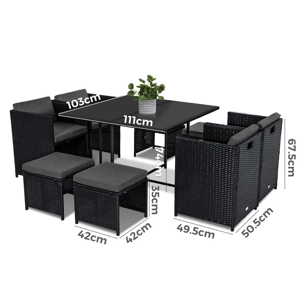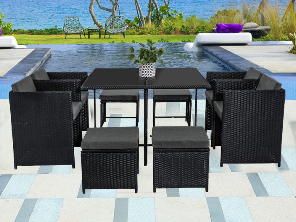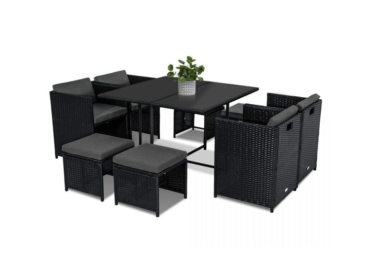This rattan garden furniture oozes style while offering a beautiful simplicity. The nine-piece dining set can become the focal point of your patio area or garden, suiting a broad variety of backyard arrangements and garden landscapes. Benefit from the contemporary coolness of rattan, as well as its durability and lightweight. Transform your outdoor living space with this superb modern minimalist furniture collection.