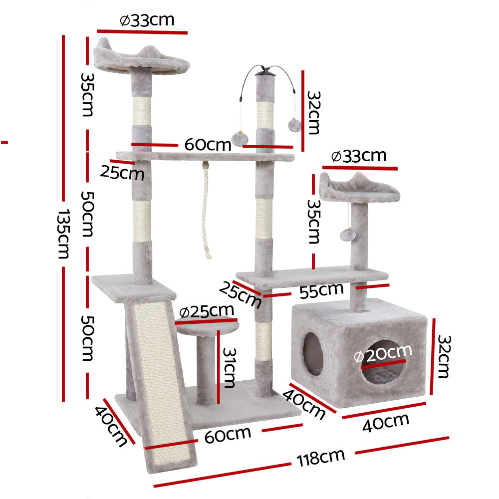 Our cat tree will let your feline friend play out its natural instinctive behaviour. It features a 4-level design with play cubicles, jumping platform, activity balls, sisal rope, sisal posts, and sisal claw board. This cat tree offers unlimited opportunities to provide your pets with fun-filled moments and keep them healthy. It also has comfortable velvet upholstered surfaces, ideal for napping after a long playtime. Furthermore, the sisal claw board is perfect for your pets to scratch and claw and keeps their claws healthy and distracts them from scratching the furniture. Crafted from fir wood with sisal rope, posts, and claw board, our cat tree is both pet and eco-friendly.