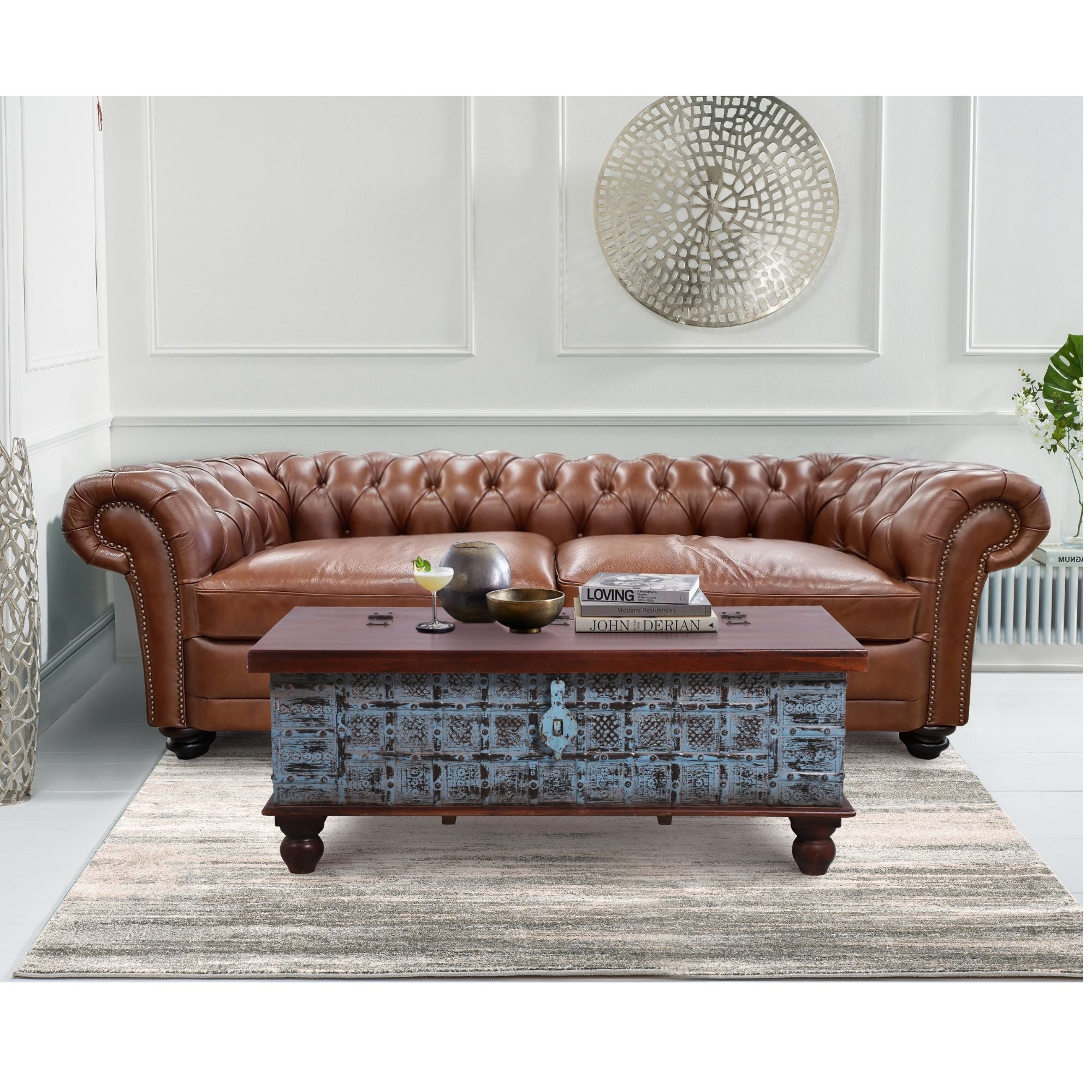 Introducing a versatile piece of furniture which is a storage trunk and also a sleek coffee table. Designed in the traditional style, it has a storage area with a hinged lid, a latch on the front and two handles on the side. The arrangement makes its movement easy. With a dark walnut finish and featuring a dynamic wood grain design, it looks so beautiful amid any interior decor setting.You may decorate it in your living area and use it as a table to keep beverage cups, devices, laptops, or even a board game. The blue painted distressed finish on the hand-crafted metal sheet of the table front adds to its antique look. The storage coffee table is made of sustainably harvested solid Mango wood with metal work on it. The wood and metalwork provide it with a robust structure and good looks. Short, scalloped legs provide the storage chest with strong support. The fully assembled storage trunk cum coffee table comes with a one-year warranty.