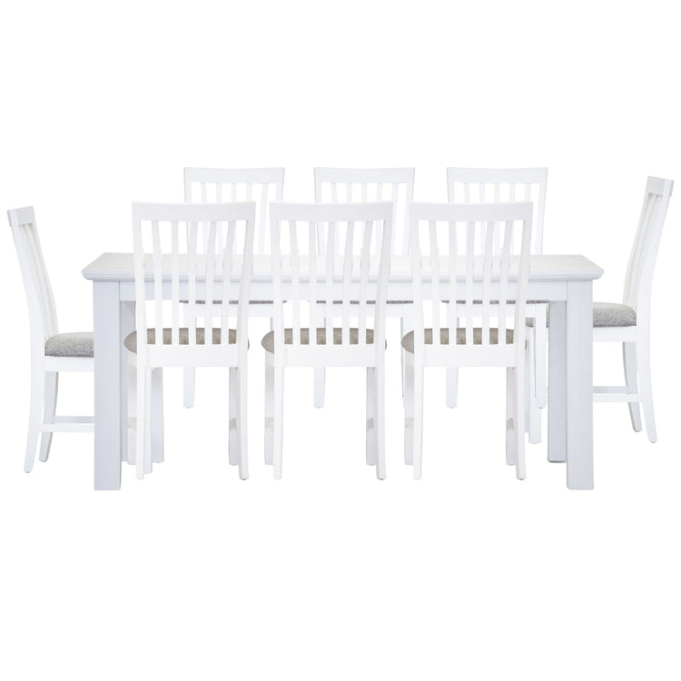 Your lovely dining space deserves a lovely dining set. This 9-piece dining set will add to the charm of this space. The entire set is designed in the coastal style, featuring minimalist, functional, and contemporary design. Due to vivid white colour, the dining set exudes a serene feel in the atmosphere, that helps in creating truly joyful moments with family. The entire dining set is made of sustainably harvested Solid Acacia and MDF. The wood ensures the strength and durability of the set for years to come. The 8-seater dining table with strong, thick legs is complemented with comfortable chairs, upholstered in 100% polyester fabric, which is soft yet resilient. The chairs look lovely as they have straight front legs and tapered back legs. A one-year warranty is included with the easy-to-assemble dining set. Only the dining table needs assembly.