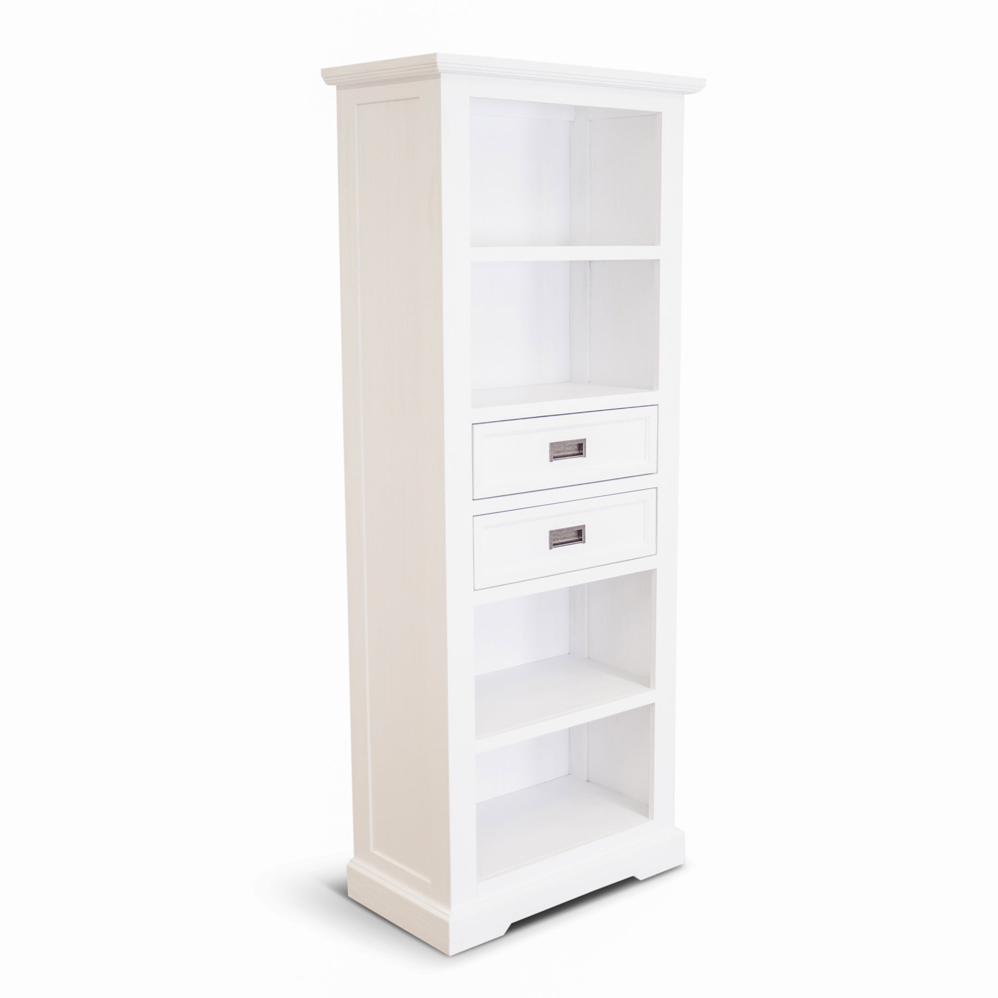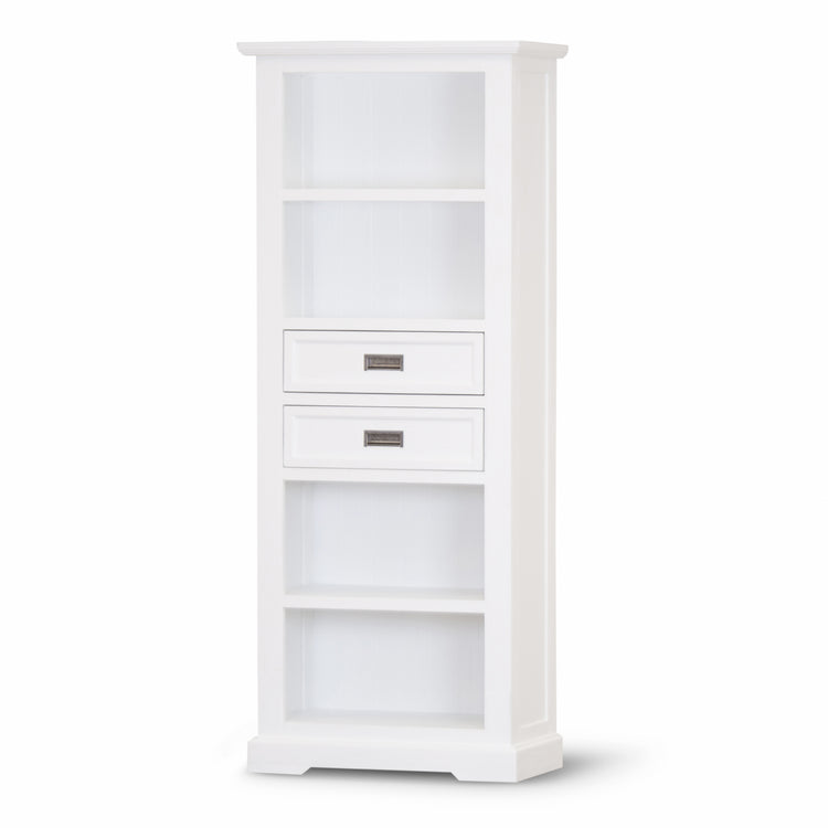 A delightfully useful piece of furniture for book lovers. This sleek and beautifully designed bookcase is composed of sustainably sourced Solid Acacia and MDF. It has 4 large open shelves and 2 drawers with full-extension metal runners. The wood ensures the strength and durability of the bookcase for years to come. The good looking bookcase is angled just at the right places to maximize its clean line aesthetics.Designed in the coastal style, the stunning bookcase features a minimalist, functional, and contemporary design. Due to the vivid white colour, it exudes a serene feel in the atmosphere, which helps in creating a nice ambience in the living area. The bookcase comes with a one-year warranty.