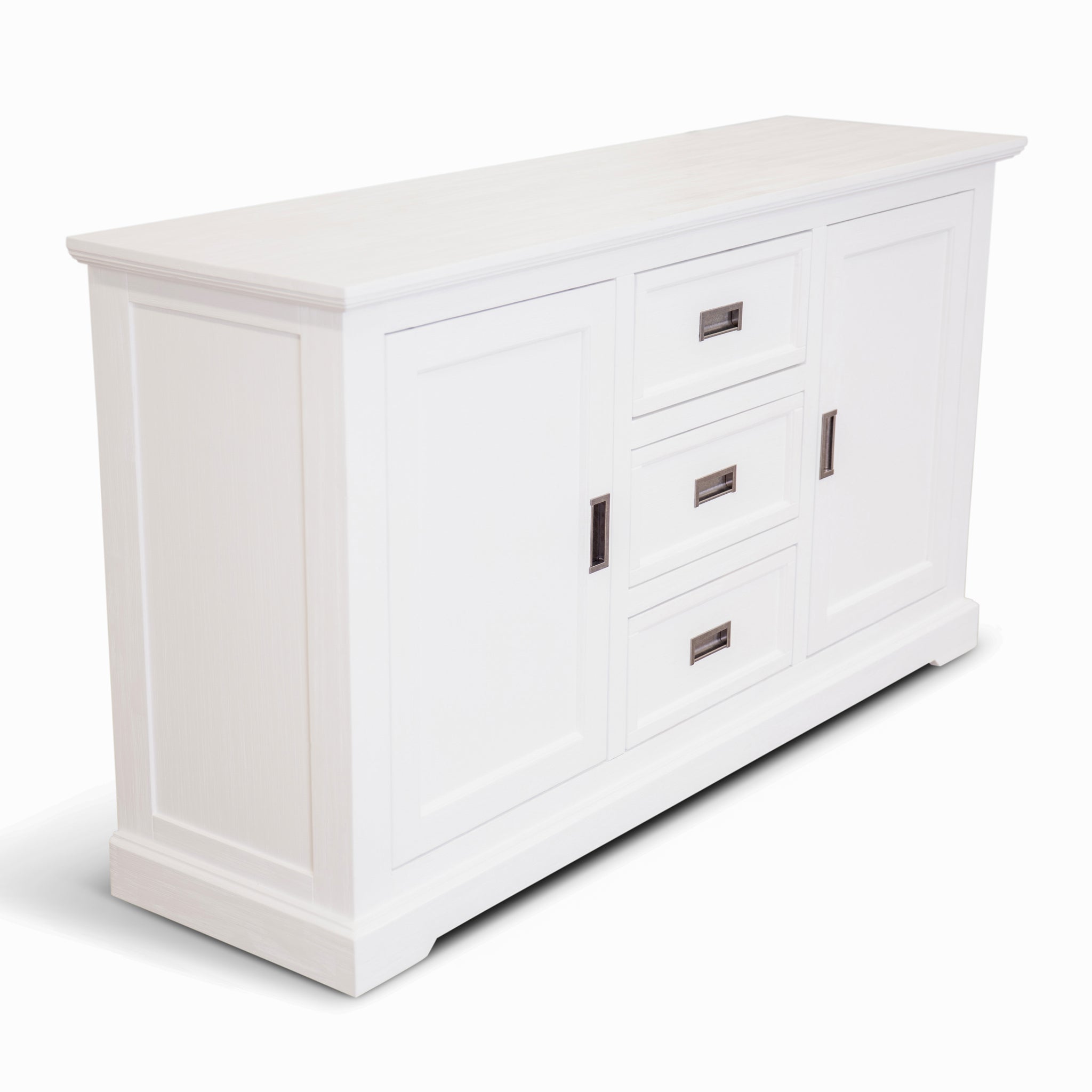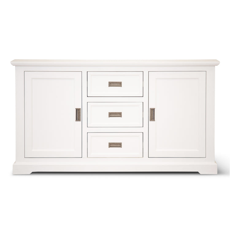 This sleek and beautifully designed 2-door and 3-drawer buffet is composed of sustainably sourced Solid Acacia and MDF. The wood ensures the strength and durability of the buffet for years to come. It takes care of your storage needs with 4 sizable compartments, covered by 2 doors that have metal hinges and metal handles. The buffet has strong drawers with full-extension metal runners and metal handles. The nice storage cabinet is angled just at the right places to maximize its clean line aesthetics.Designed in the coastal style, the stunning buffet features a minimalist, functional, and contemporary design. Due to the vivid white colour, it exudes a serene feel in the atmosphere, which helps in creating a nice ambience in the living area. The buffet comes with a one-year warranty.