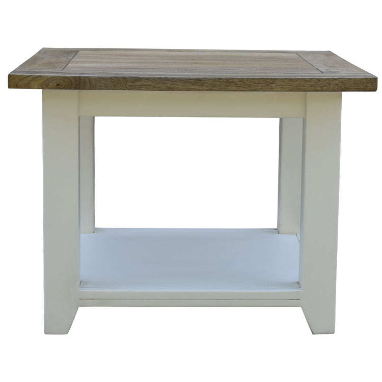 This beautiful side table gives your living room the perfection it deserves. With 1 open lower shelf, it offers better functionality. Designed beautifully, the multi-coloured side table features a lightly stained natural timber tabletop, contrasted with white painted beautifully cut legs. The two-tone range looks gorgeous in a variety of interior decor styles. Designed by using the elements of a combination of styles, including Hampton, Coastal, Modern Farmhouse, and French Provincial, the table exudes perfection effortlessly. It is made of sustainably harvested, solid mango wood using traditional construction techniques that ensure perfect cuts and an impeccable shape to suit your taste. The wood makes the table strong and durable while providing water and heat resistance. A one-year warranty is included with the easy-to-assemble side table.