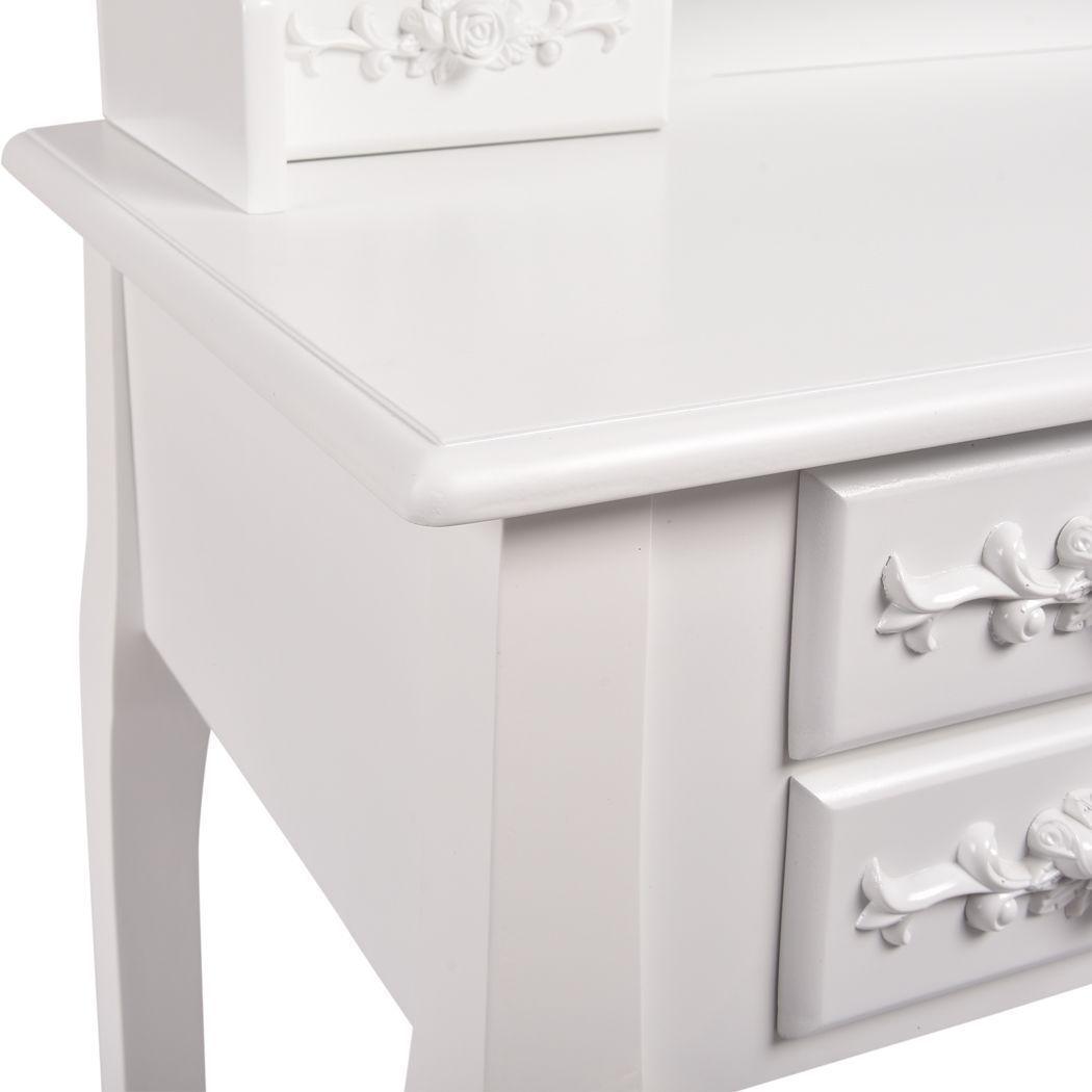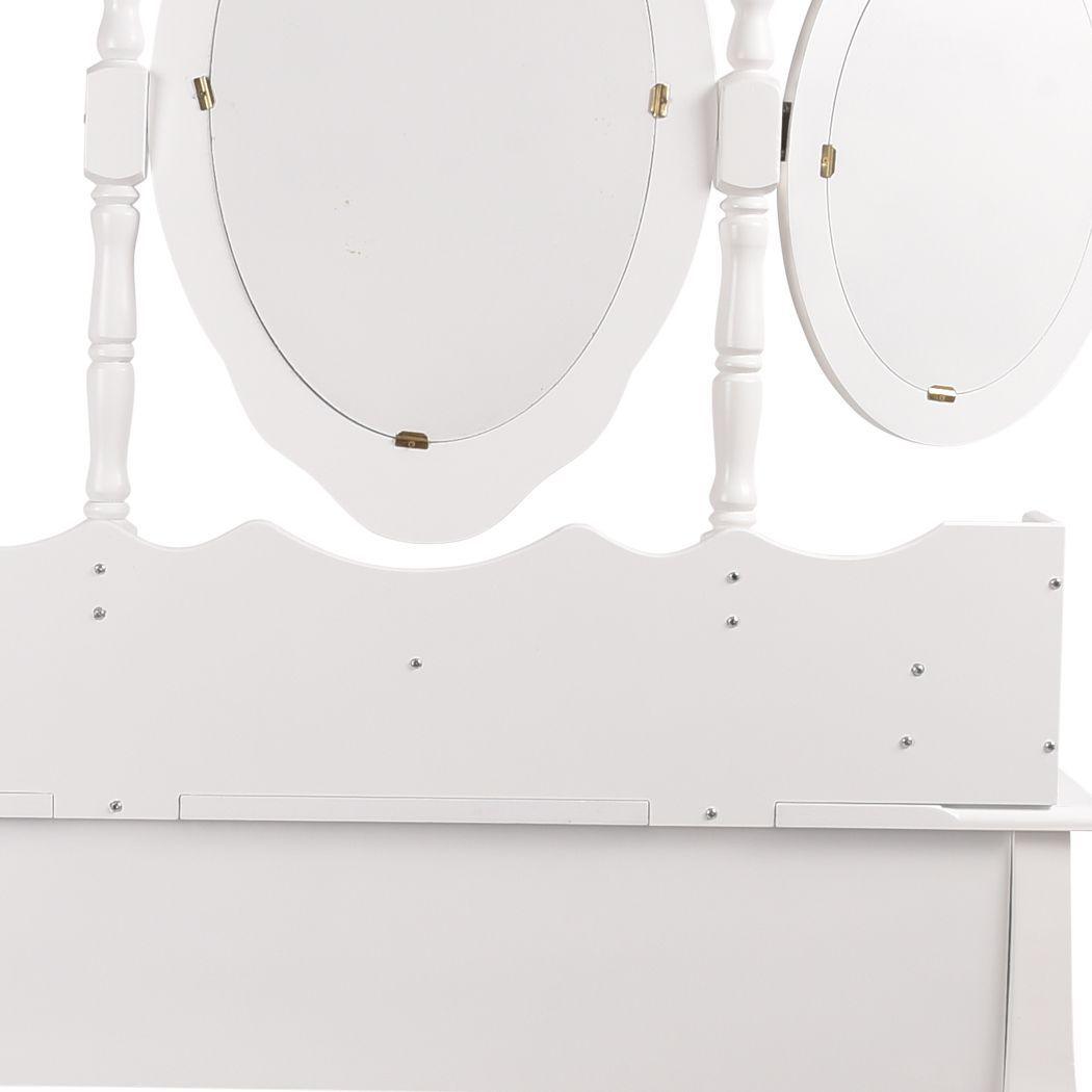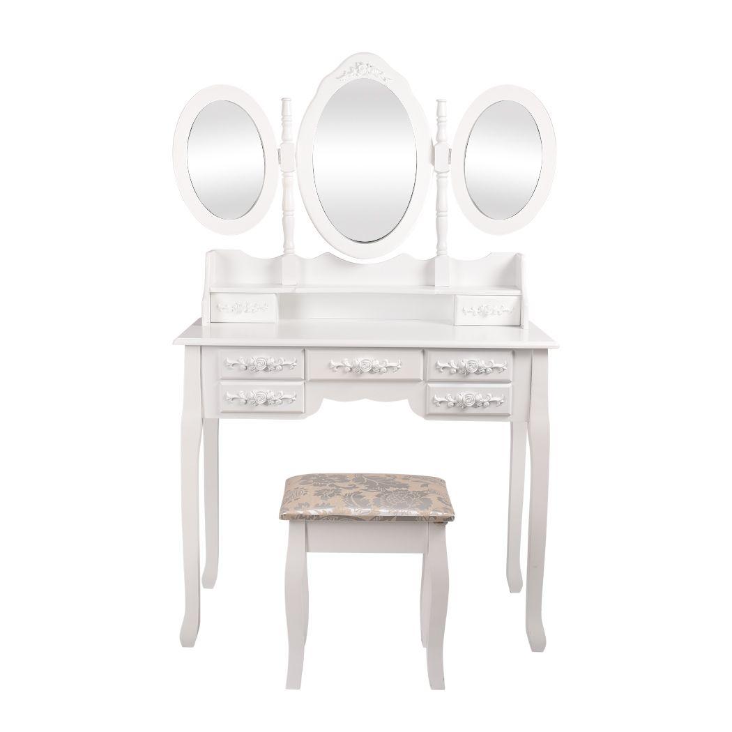 Beautiful, high end French style white dressing table with 3 mirrors. Elegant Louis Marie Antionette makeup desk vanity with stool.