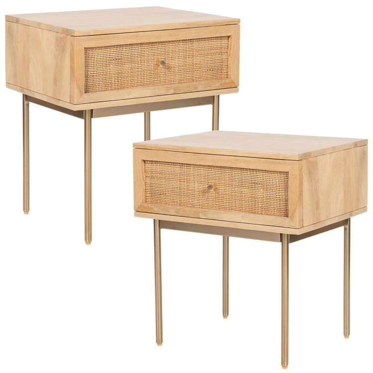 This 2-piece set of 1-drawer bedsides is a furniture masterpiece displaying the beauty of natural aesthetics. It is a versatile storage case designed in the contemporary style that looks lovely in the bedroom. Made of sustainably harvested mango wood, the furniture pieces have a gorgeous rattan weave on the drawer fronts. Mango wood is valued for its robustness, longevity, and resistance to mould or moisture. The full-extension metal runner and brass powder-coated metal handle on the sizable drawer add to the practical functionality of the bedside tables. Strong metal legs provide a sturdy base for the furniture. Due to their natural colour, the furniture pieces bring a sense of cosiness and warmth to your bedroom, and they complement diverse interior decor styles or bed designs. The easy-to-assemble furniture comes with a one-year warranty.