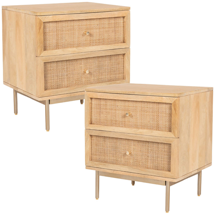 This 2-piece set of 2-drawer bedsides is a furniture masterpiece displaying the beauty of natural aesthetics. It is a versatile storage case designed in the contemporary style that looks lovely in the bedroom. Made of sustainably harvested mango wood, the furniture pieces have a gorgeous rattan weave on the drawer fronts. Mango wood is valued for its robustness, longevity, and resistance to mould or moisture. The full-extension metal runners and brass powder-coated metal handles on the sizable drawers add to the practical functionality of the bedside. Strong metal legs provide a sturdy base for the furniture pieces. Due to their natural colour, the bedsides bring a sense of cosiness and warmth to your bedroom, and they complement diverse interior decor styles or bed designs. The easy-to-assemble bedside tables come with a one-year warranty.