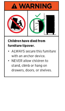 - NEVER allow children to stand, climb or hang on drawers, doors, or shelves.