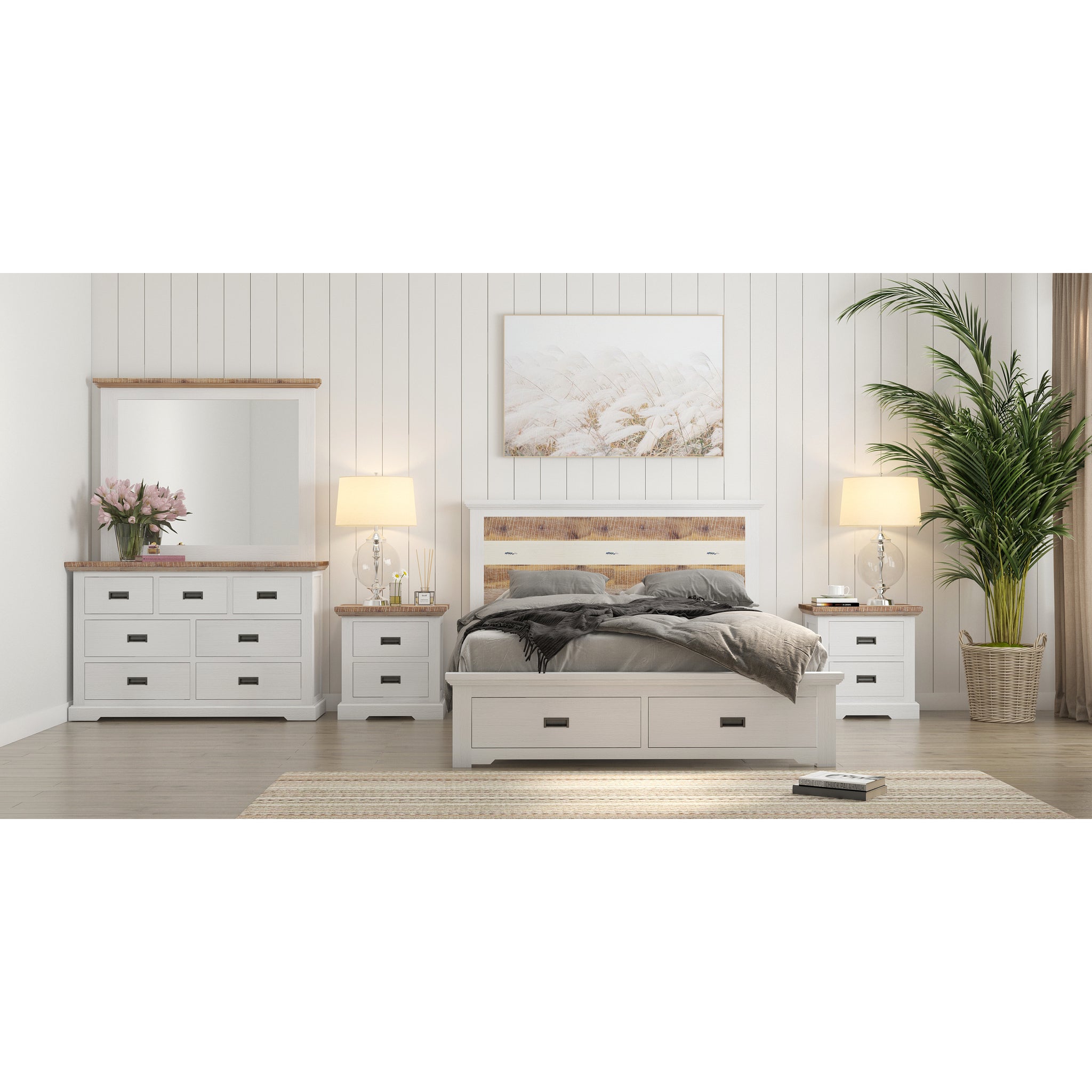 This queen-bed dresser mirror suit in modern-rustic style embellishes your bedroom amazingly. The suite transforms your bedroom into a relaxing haven where you can unwind while keeping the rest of the room neat thanks to the extra storage space. The suite consists of 1 queen bed having 2 storage drawers, 1 dresser with 3 over 4 drawers, 1 mirror, and 2 bedside tables with 2 drawers each. All the drawers are adorned with smooth metal extension runners and shining metal handles, and they collectively enhance the storage capacity of your bedroom. The mirror, with a high-quality looking glass made of annealed glass for improved durability and strength, will give your bedroom a fashionable look. The whole furniture collection is made of solid Acacia timber, harvested in a sustainable way. The multi-coloured suite goes with a variety of interior decor styles and comes with a one-year warranty. In the suite, only the bed needs to be assembled.