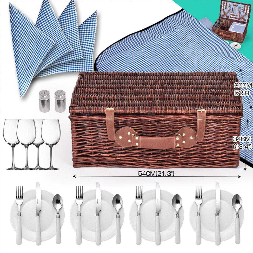 Luxury, 4 person picnic basket set. Includes high quality, long lasting wicker basket, blanket, insulated food bag to keep food & drinks safe & cold (which is important for champagne), 4 wine glasses, cutlery: 4 knives, 4 spoons, 4 forks, 4 plates, napkins & salt & pepper shakers.