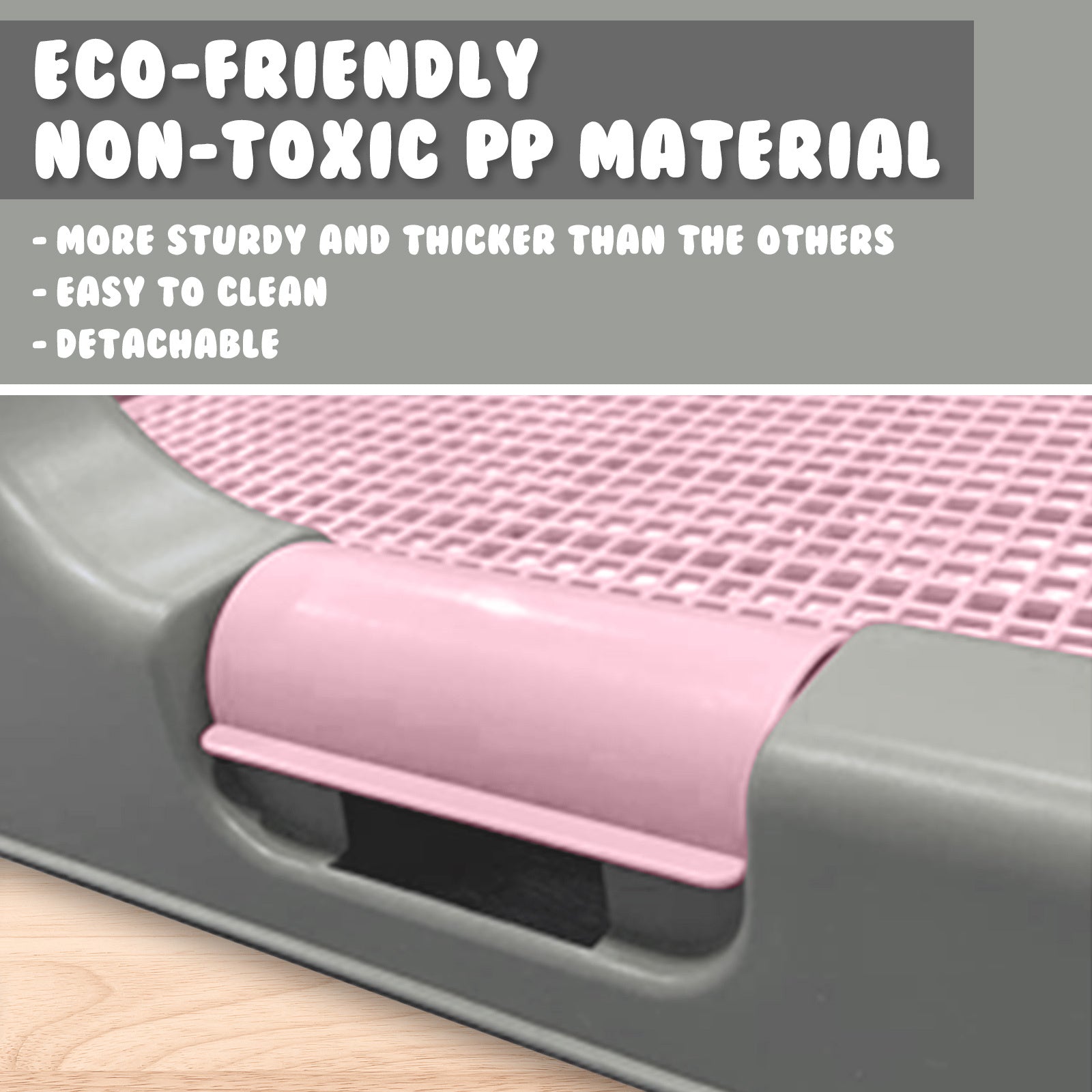 PS KOREA Dog Potty Tray is designed to keep pee where it belongs and to keep your furry companion's potty area sanitary. This plastic tray features a leak-proof design and a detachable high wall. The perforated grate/mesh panel allows urine to carry to the tray underneath and prevents pups from tearing up the potty-training pad inside. They will also love using the potty tray as an indoor toilet. * Training pad/Grass mat is not included in this purchase.