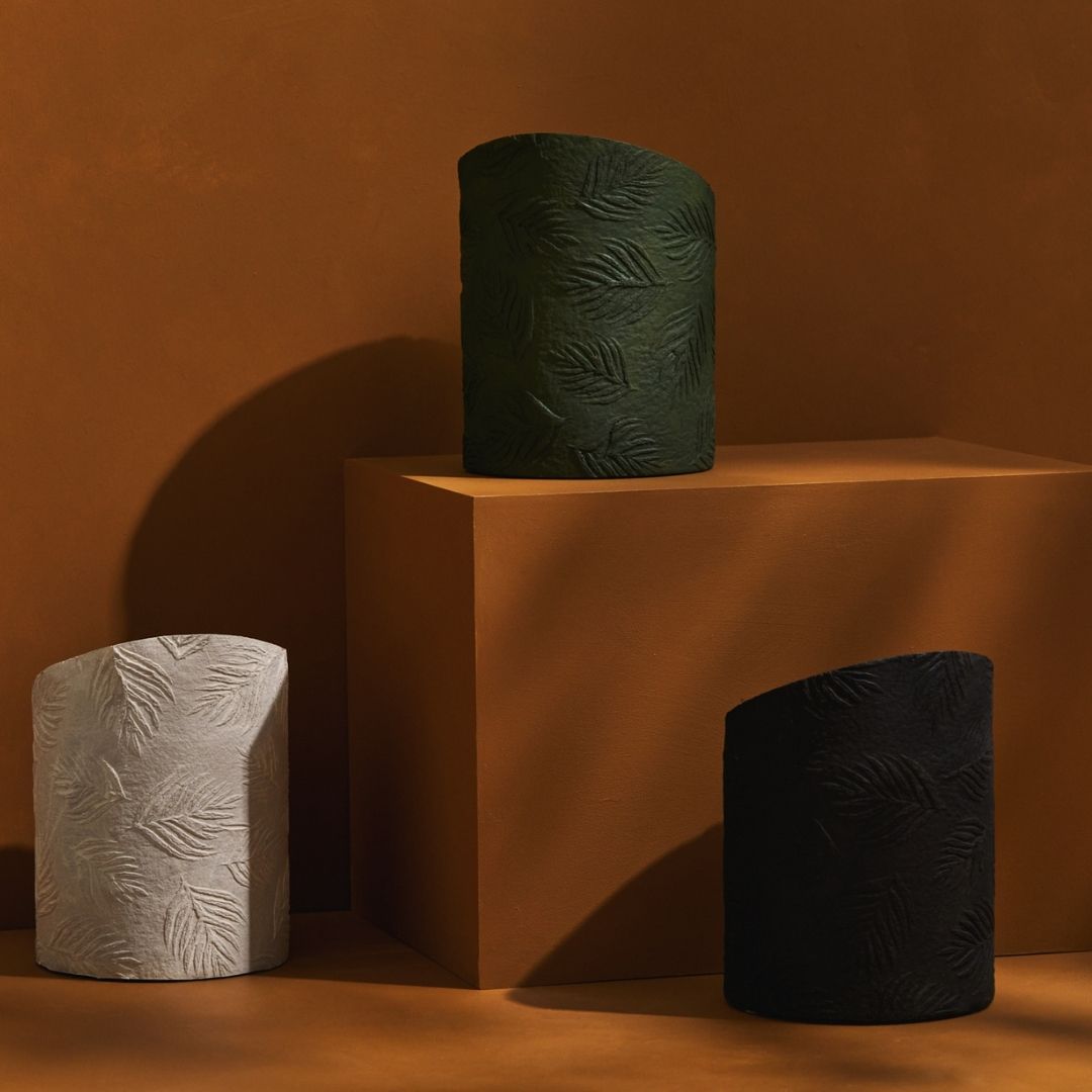 The unique sliced sculpture design of the Hi-Lo Palms pot with beautifully embossed palm leaves will provide the perfect backdrop for just about any plant or a bouquet of flowers.