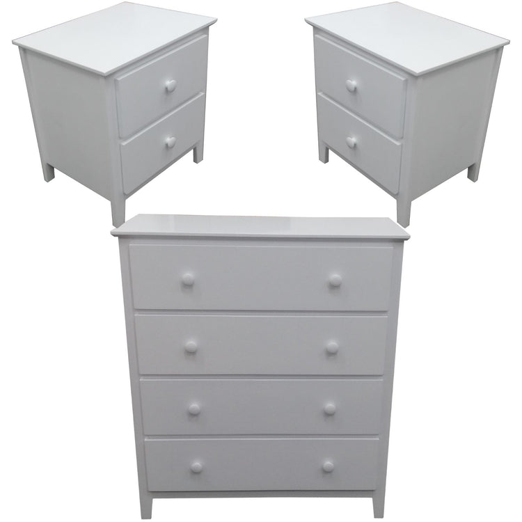 Storage cabinets keep your living room tidy.This beautiful bedside-tallboy set is painted in a white finish and designed in the Hampton style to give a charming look to your bedroom while keeping it well-organized.The good-looking tallboy has 4 big drawers while both bedsides have 2 drawers each. All the drawers have full-extension metal runners and round timber painted handles. The whole furniture set is made of Rubber wood, and MDF harvested in a sustainable way. The wood is known for its strength, resilience, and rot resistance. The MDF wood is resilient to moisture damage, and the rubber wood keeps the furniture weather-proof. The sleek and fully assembled furniture set looks lovely in a variety of interior decor styles and comes with a one-year warranty.